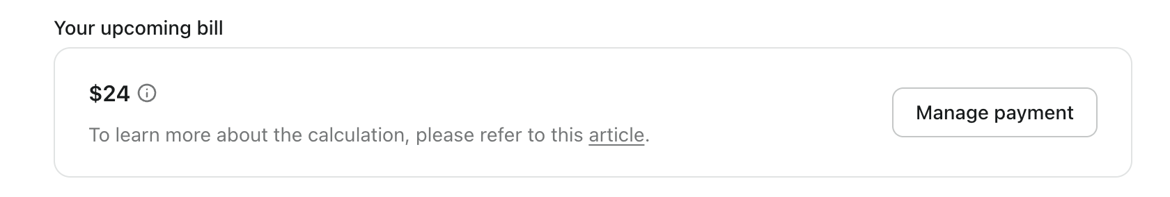 Your next bill=$24(base price)+add-on cost (unbilled usage)+add-on cost (next cycle charge)\begin{align*} \text{Your next bill} &= \$24 \text{(base price)} \\ &+ \text{add-on cost (unbilled usage)} \\ &+ \text{add-on cost (next cycle charge)} \end{align*}